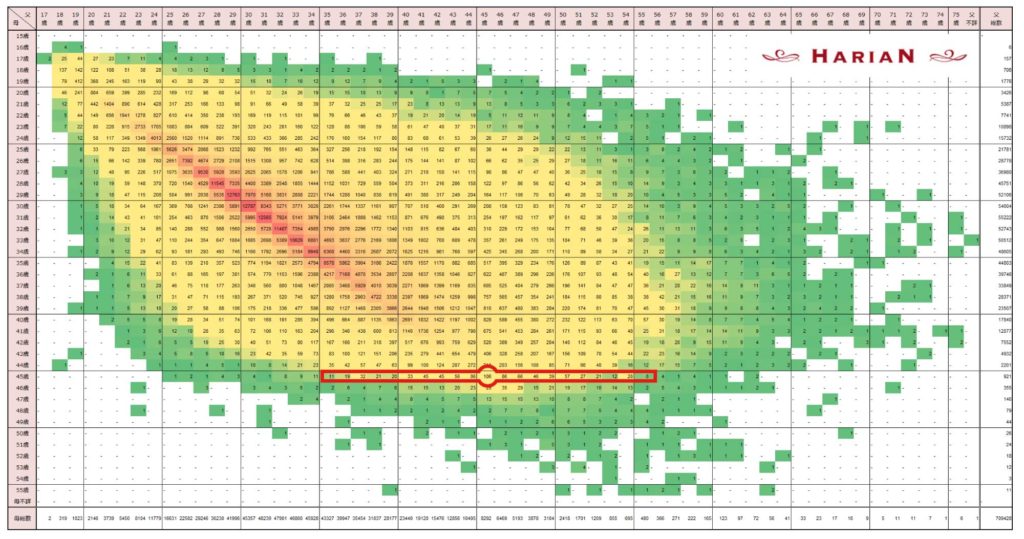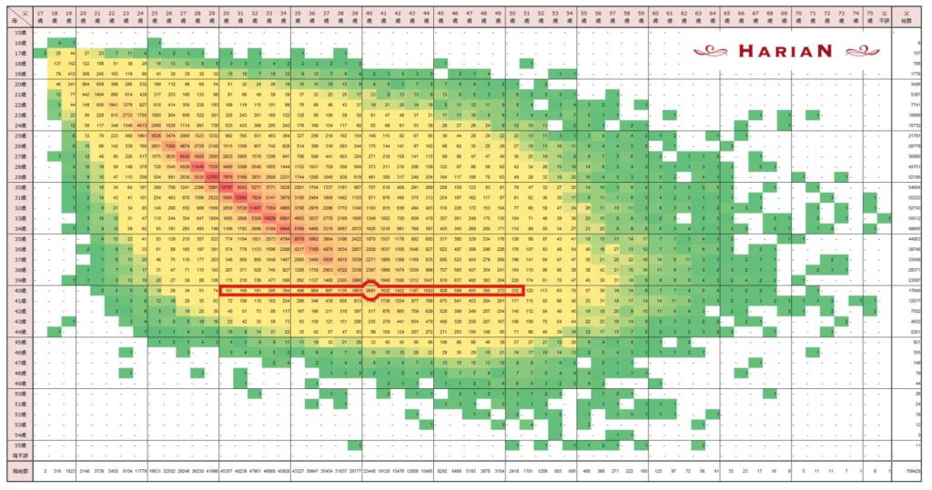 40歳を中心に、左右10歳差までを見てみると、いずれも黄色のゾーンに入っており、10歳年上でも10歳年下でも、ほぼ同程度の出産数であることが分かります。